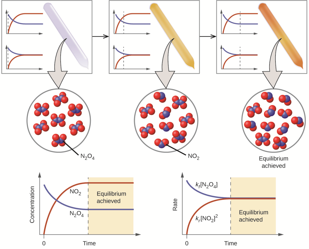 Hasta que se alcanza el equilibrio. Se trata de un equilibrio dinámico, ya que las moléculas siguen reaccionando incluso una vez alcanzado el equilibrio. A partir del cual las concentraciones y las velocidades se mantienen constantes. En equilibrio la velocidad directa, de izquierda a derecha, es igual a la de la reacción inversa, de derecha a izquierda y el incremento de la energía libre de Gibbs es 0.
