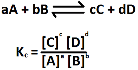 En una reacción química el producto de las concentraciones de los productos, en el equilibrio, elevadas a sus respectivos coeficientes estequiométricos, dividido por el producto de las concentraciones de los reactivos, en el equilibrio, elevadas a sus respectivos coeficientes