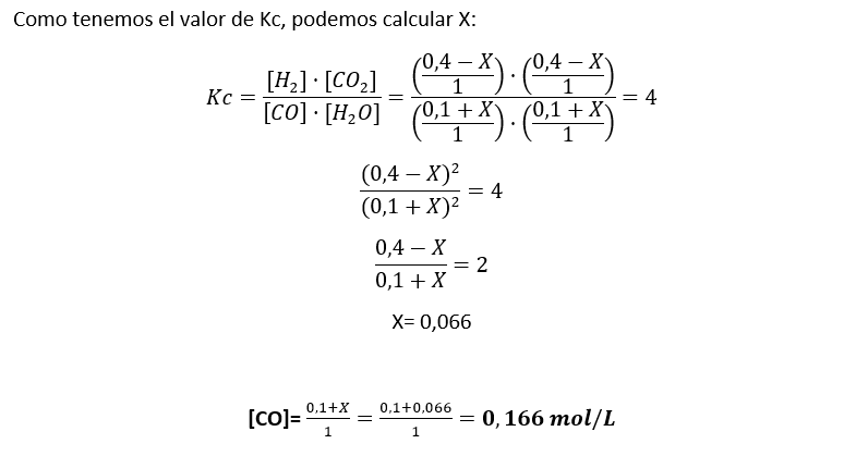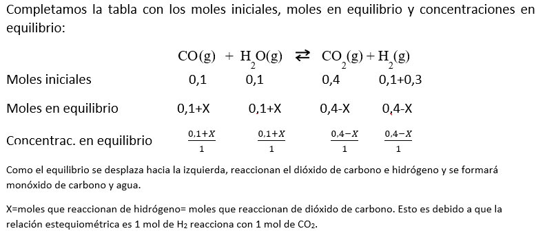 0,1; 0,1; 0,4 y 0,1 moles, respectivamente, en un matraz de 1 litro. Se añade 0,3 moles de H2 a la mezcla en equilibrio (sin modificar el volumen). Hallar la nueva concentración de CO una vez restablecido el equilibrio.