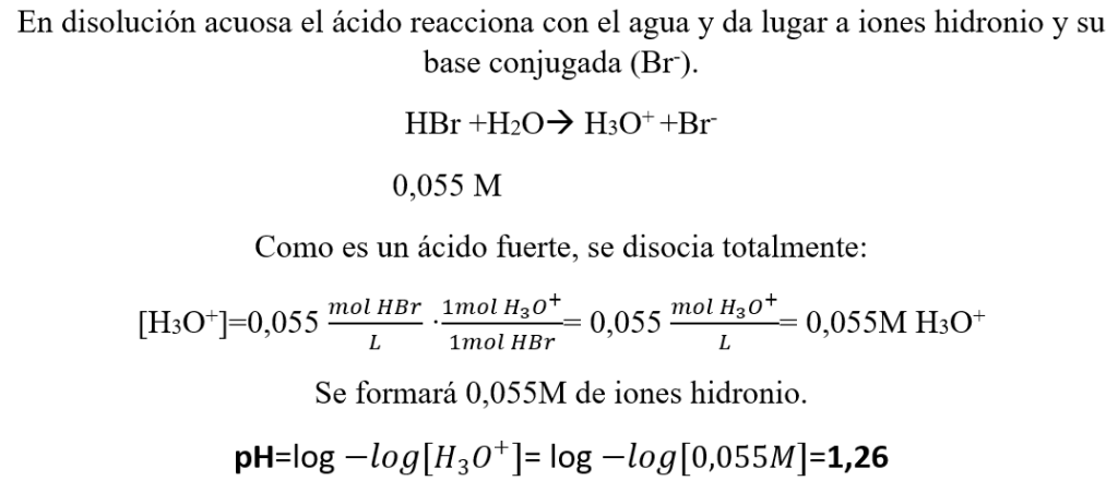 1.Calcula el pH de una disolución acuosa de HBr 0,055 M.