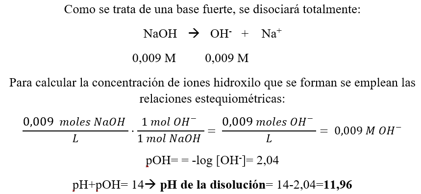 1.Calcula el pH de una disolución acuosa de NaOH 0,009 M.