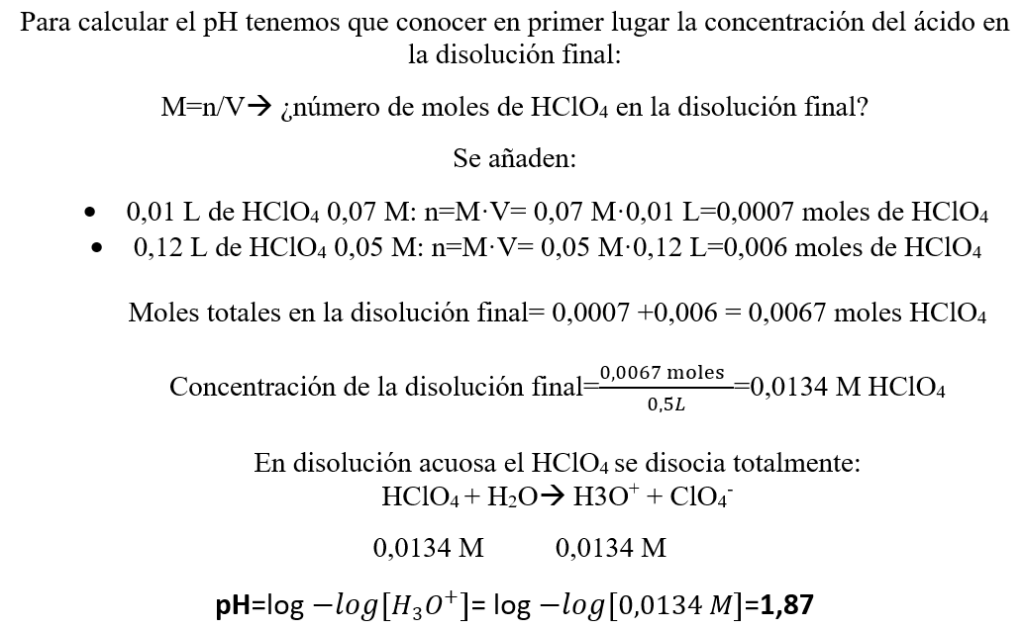 2.Calcula el pH de una disolución de HClO4, preparada en un matraz de 500 mL: 0,01 L de HClO4 0,07 M, 0,12 L de HClO4 0,05 M y se enrasa con agua hasta 500 mL.