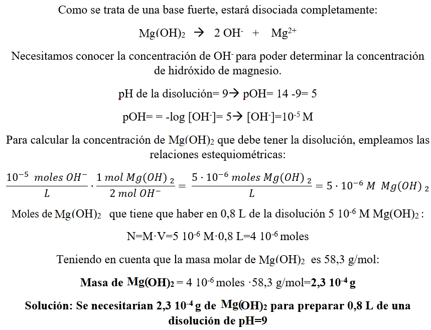 2. Calcula los gramos de Mg(OH)2 necesarios para preparar 0,8 L de una disolución de pH=9. Masas atómicas: Mg= 14,3; O=16; H=1.