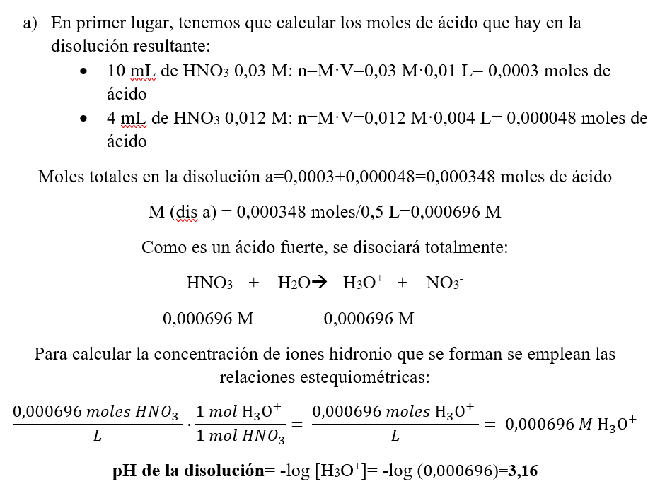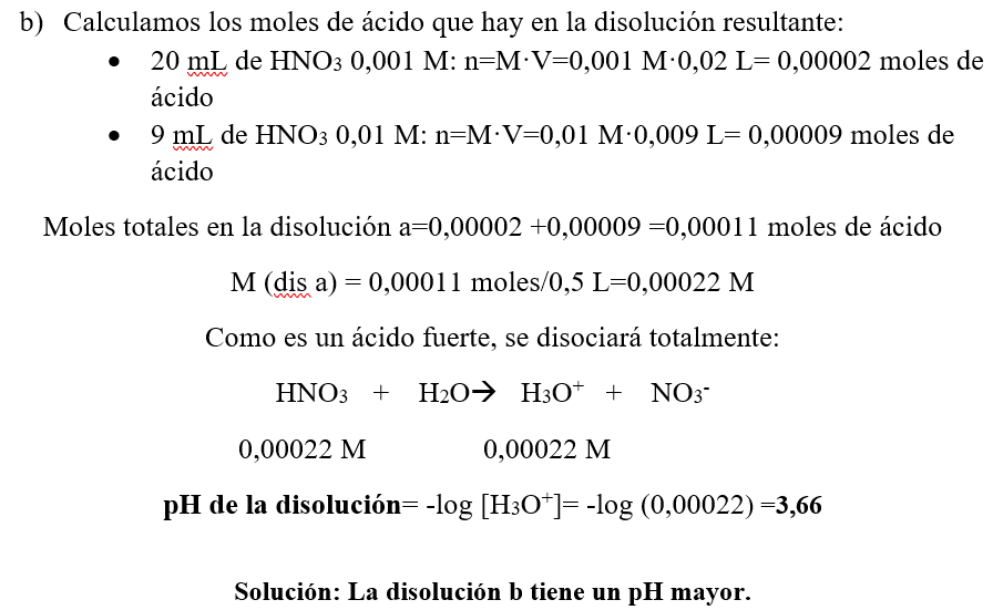 3. ¿Qué disolución tendrá un mayor pH? a) 500 mL de disolución: 10 mL de HNO3 0,03 M+ 4 mL de HNO3 0,012 M+ agua hasta enrase; b) 500 mL de disolución: 20 mL de HNO3 0,001 M+ 9 mL de HNO3 0,01 M+ agua hasta enrase.